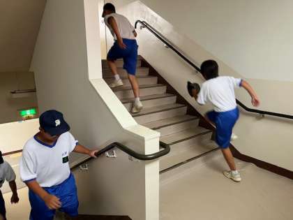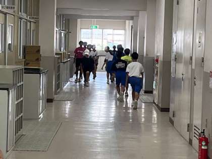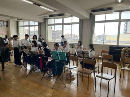 吹奏楽部、ソフトテニス部、野球部の活動です。グランドを使っている運動部は、室内でトレーニングです。