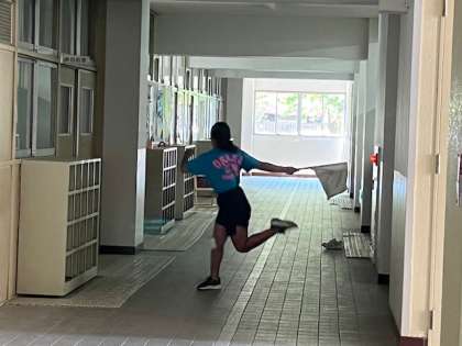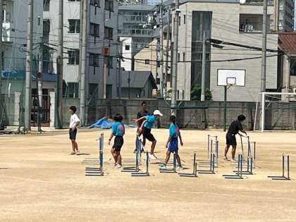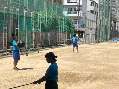 陸上部は、8/9(金)に記録会があります。日陰で休憩を入れながら練習を行っています。円盤・砲丸種目の生徒は、基礎トレーニングを進めています。なお、明日8/8(木)まで体育館の照明を水銀灯からLEDに交換する工事を行っていますので体育館が使用できません。