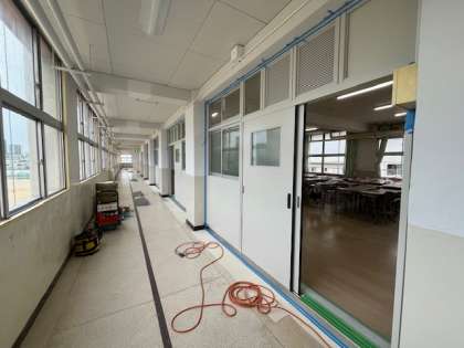 2年生1から4組教室の窓、ドアが完成間近です。みんなで大事に使っていきましょう。三稜中学校1年生校舎は昭和35年、2年生校舎は昭和50年に建てられてます。これまで改装を行い、先輩たちが大事に使ってきた伝統ある校舎です。