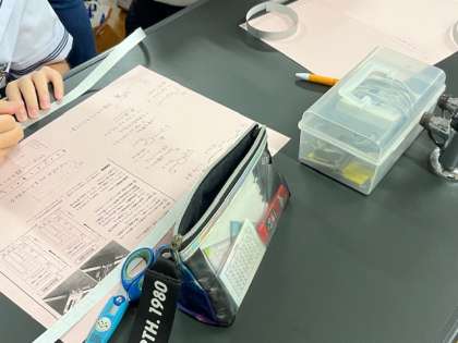 3年生「理科」実験の授業です。記録タイマーを使って運動の記録をとります。記録タイマーは、1/60秒ごと(西日本)に記録されますので、6打点ごと(1/10秒)のテープを張り付けて運動の様子を考察します。
