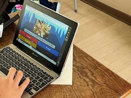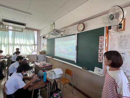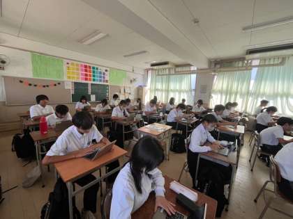 2年生「英語」の授業です。タブレットパソコンを使い、英語の問題を解いています。ゲーム形式になっており、みんなで頑張れば、サメから逃げることができます。中間テスト前になりました。楽しみながら復習問題をしています。