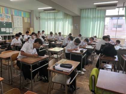 明日から中間テストです。テスト前の復習を行っています。問題演習をしたり、教えあったり、タブレットパソコンを使って学習したりしています。繰り返し学習することが得点への近道です。
