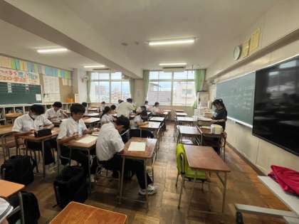 中間テスト終了後の午後から準会場として「英検」の試験を行いました。試験が始まる前の様子です。この間、問題集を借りて家庭学習をしていた生徒が多くいます。努力が結果につながることを期待します。
