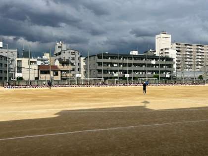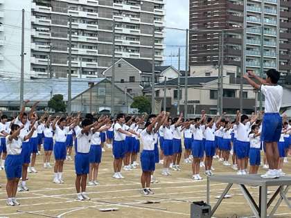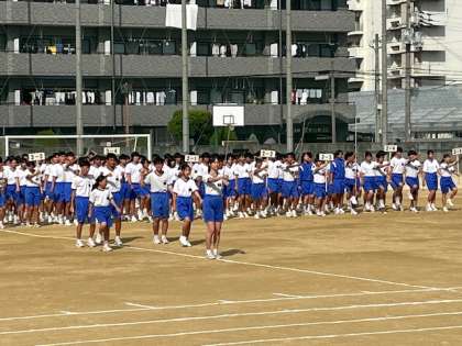 午後からは、運動会の全体練習を行いました。生徒約540名が一堂に会して、生徒席、開会式・体操の隊形などの確認を行いました。今日は、蒸し暑い気候です。各自、水筒を持って運動場に集合しています。
