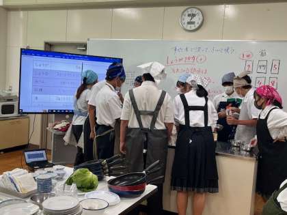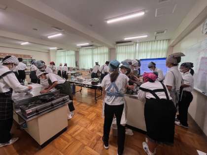 2年生「家庭科」の授業です。豚肉の生姜焼きをつくっています。生姜を擦ったり、たれをつくったりグループで手分けして手際よく行っています。美味しくいただきました。