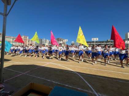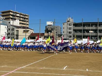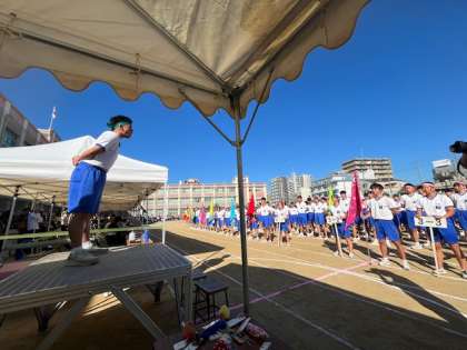 運動会開会式です。多くの保護者、来賓に方にご来場いただきありがとうございます。