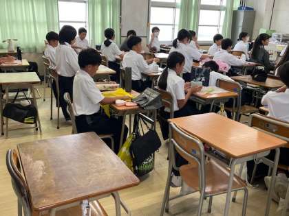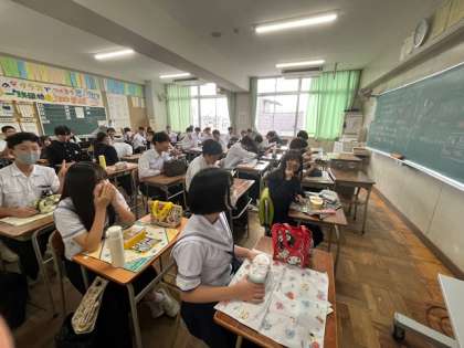今日は給食かないため、家庭から昼食の用意をして登校しています。みんなで「いただきます」