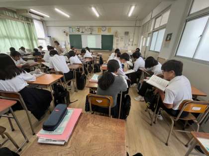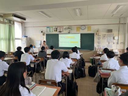 2年生「英語」の授業です。「受け身の肯定文」について学習しています。日本語の語順と英語の語順が違うので、英語は難しく感じます。「彼はみんなから愛されている」は英語では「彼は いる 愛されて から みんな」というイメージになり「He is loved by everyone.」です。繰り返し学習して慣れましょう。
