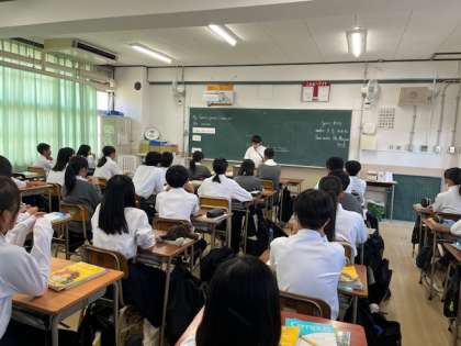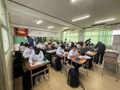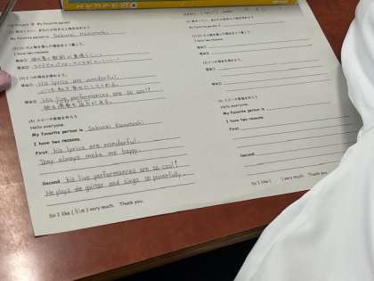 1年生「英語」の授業です。"My favorite person"についてのスピーチ原稿を考えています。日本語で言うと「お気に入りの人」「推しの人」です。その人物を紹介した理由について2つ考え、英文をつくり発表します。スピーチですので、感情をこめて表現しましょう。