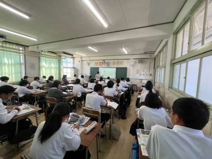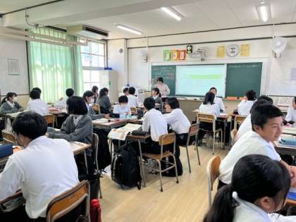1年生「社会科」の授業です。古代のキーパーソンを選び、その時代の特色をまとめます。各班の課題の中で最も重要だと思う人物を挙げ「くらげチャート」を完成させます。くらげの頭に重要人物を書き、足の円の部分にその人物が行ったことや社会にあたえた影響などを記入し整理していきます。