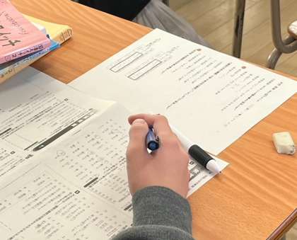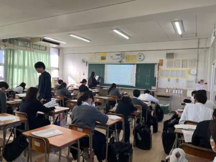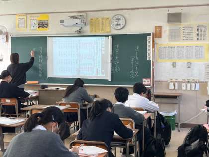 2年生「国語」の授業です。文法についての学習です。動詞の活用は、五段活用、下一段活用、カ行変格活用など言葉だけを聞くと難しく感じてしまいます。例えば、咲かない・咲きます・咲く・咲くとき・咲けば・咲け と口にすればわかりやすいので、興味をもって学習していきましょう。