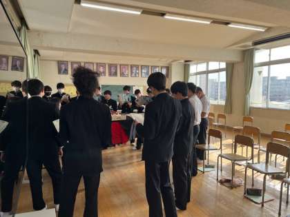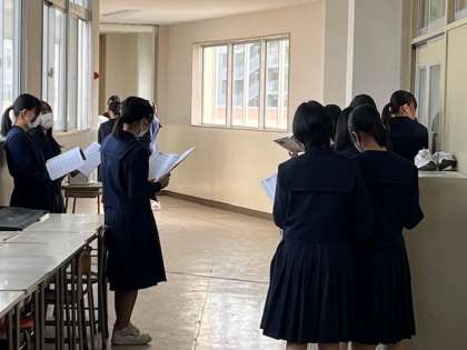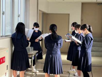 3年生「音楽」の授業です。「ふるさと」の混成4部合唱の練習です。パートに分かれて歌っています。♪うさぎ追いし かの山… 自然な響きある歌声で、お互いの声を聴きながら声を合わせて歌います。