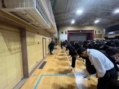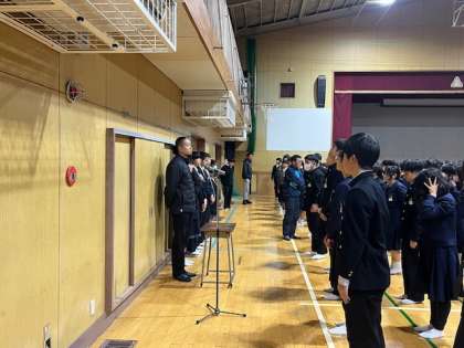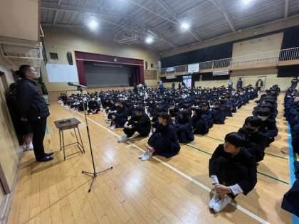 全校集会の様子です。校長先生から「面接」について話がありました。意欲や人間性はペーパーテストでは測れません。入試の時に面接がなくても、就職のときは必ず面接があります。日ごろの学校生活でも当たり前のことを当たり前にすることが面接試験に合格する秘訣です。