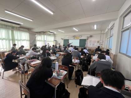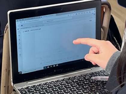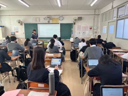 2年生「英語」の授業です。タブレットパソコンを使い、英語の演習問題をしています。今の2年生が来年度受験する全国学力テストの理科は、パソコンを使って回答します。将来的には全国学力テストはすべての教科でパソコンを使っての解答となります。答えを日本語・英語で入力できることが求められます。