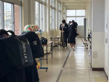 午後から懇談会がありますので、給食をとったあと清掃を行い下校します。教室・廊下はは懇談会用に机・椅子を並べています。保護者の皆様は、懇談会にご出席の際は「入校証」をお持ちください。