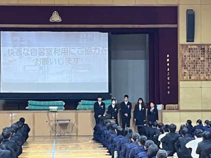 生徒会執行部から、放課後の自習室利用について連絡がありました。設置した「目安箱」に自習室開設の要望が入っていました。生徒会執行部が中心となり使用のルールなどを決めました。入試前に放課後5時まで自主学習したい人は利用してください。みんなが効果的に学習できるよう静かに!