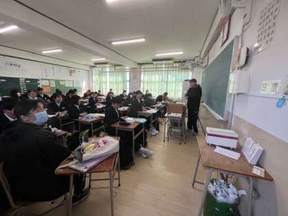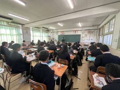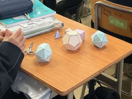1年生「数学」の授業です。正多面体について学習しています。実際に正多面体の模型をつくり、面の数、頂点、辺の数など立体が頭に浮かぶようにしています。