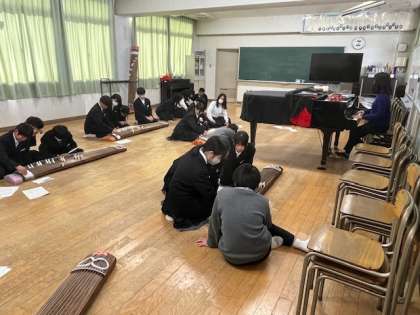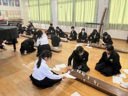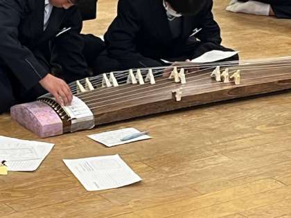 1年生「音楽」の授業です。琴の学習です。サクラ・サクラ…♪の琴の演奏をしています。班で交代で行い、相互チェックをしています。全員弾けるようになりましょう。