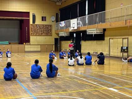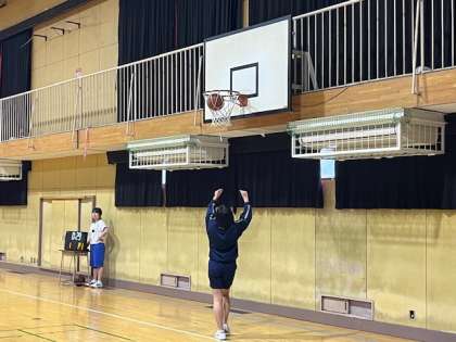 2年生「体育」の授業です。バスケットボールを学習しています。決められた時間に何回ゴールできるかを競っています。がんばれという声援のもと、これまでに身につけたことを200%発揮しましょう。