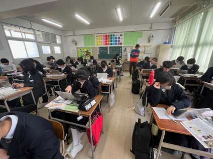 2年生「社会科」の授業です。東北地方の工業について学習しています。タブレットパソコンを使い、AIも活用しながら調べたことをプリントにまとめます。ネットに書かれてあることがすべて正しいとは限らないので、教科書・資料集なども使い、確かめています。