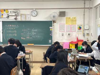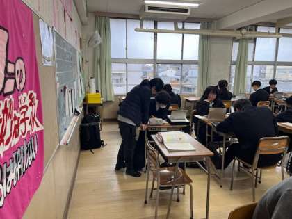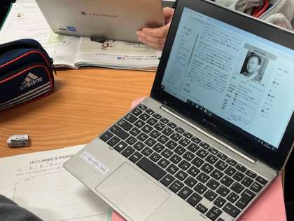 2年生「英語」の授業です。人物を決めて、グループで分担し、どんな人か・エピソードなどを調べ、英語でまとめています。タブレットパソコンも活用し、LET'S MAKE A POSTER に取り組んでいます。
