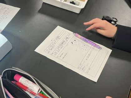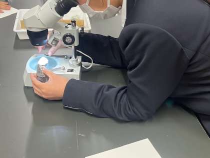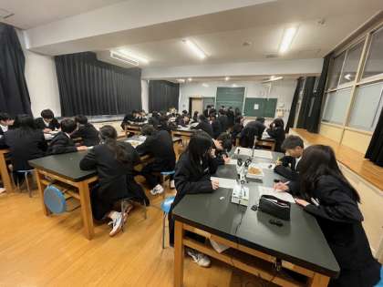 1年生「理科」の授業です。岩石の観察です。堆積岩を実体双眼顕微鏡を使って観察しています。れき岩・砂岩・チャートなどの堆積岩の特徴をプリントにまとめています。チャートはかたい岩石です。何が堆積してできたものでしょうか。