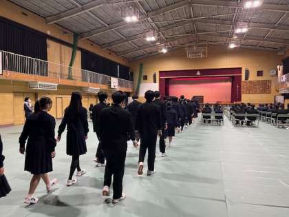 3年生は卒業式の練習を行いました。卒業生164名ひとり一人に卒業証書を授与します。自分の座席から壇上に進み、証書をもらったあと、どこに座るのかを確認しています。卒業式は厳粛で清新な気分の中で行っていきます。