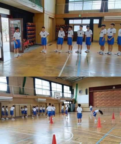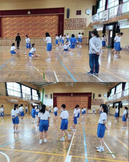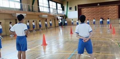 4時間目、2年生は体育館で集団行動を学んでいます。