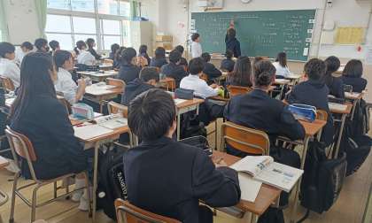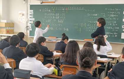 黒板の数直線上の、問いの答えを表す位置に、生徒がマグネットを貼り付けています。