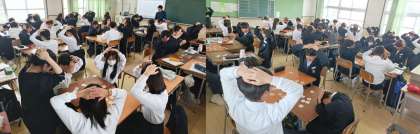 今日は2組が、机の上にアルファベットのカードを並べ、カルタのように指示されたカードを早く取るゲームをしています。