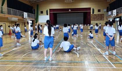4時間目、1年1,2組は体育です。集団生活で大切な「あいさつ」の練習をしています。