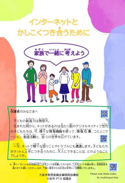 ページ右下の『配布文書一覧』に保護者向けリーフレット「インターネットとかしこくつき合うために」をアップしました。