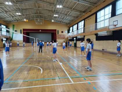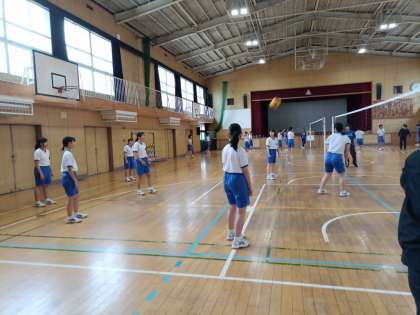 体育館で、バレーボールをしています。
