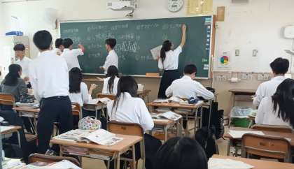 練習問題の答えを黒板に生徒が板書しています。