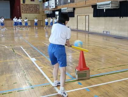 ボールの芯を叩くのが難しく、コーンごと前にとばす生徒が、多いです。