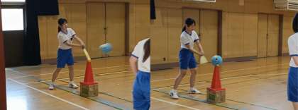 女子は、ソフトボールの練習で、コーンに乗せたバレーボールをバットで打っています。