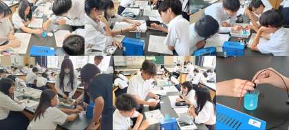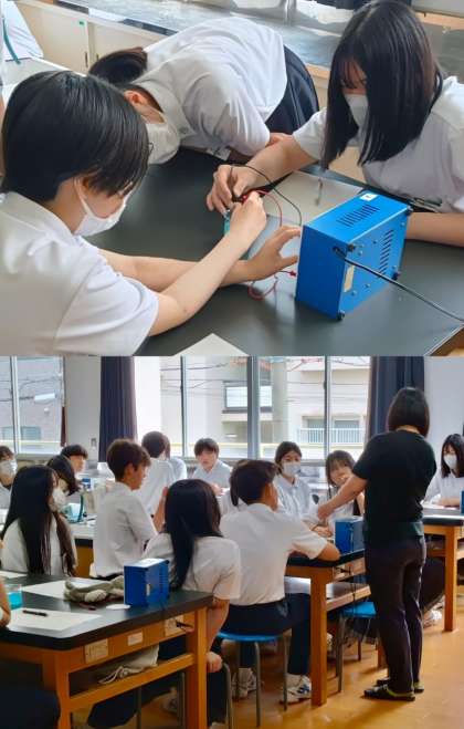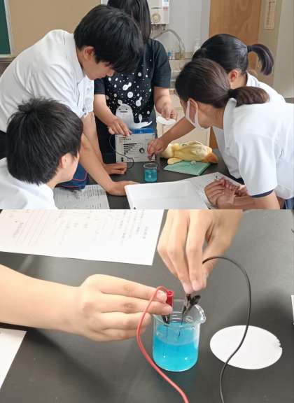 マイナス極のシャーペンの芯には銅が析出されるので、紙で拭き取りながら、実験をしています。