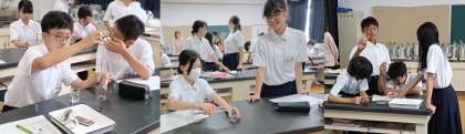 メスシリンダーに水を入れて、体積をはかっておき、そこに固体の物質を入れて、増えた体積が固体の体積に等しくなる法則を利用して、物質の体積をはかっています。