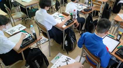 クラスを2つに分けて、教室では毛筆の書写、多目的室では硬筆の書写をしています。