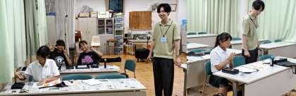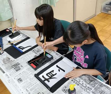大学で書道を専攻する学生ボランティアの先生が丁寧に指導してくれています。