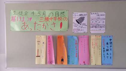 5月16日(月)全校集会を行いました。校長から、横断歩道を渡るときに、停車してくれた運転手の方にお礼の気持ちを態度で表すことで相手も温かな気持ちになることについて話しました。その後、生徒議会からの報告を行い、生徒会からは、熊本地震の義援金の募金活動への協力のお礼と報告、ベルマークボランティア募集のお知らせ等を行いました。詳しい内容は生徒会新聞に書いてあるので、生徒の皆さんは、をしっかり読んでください。