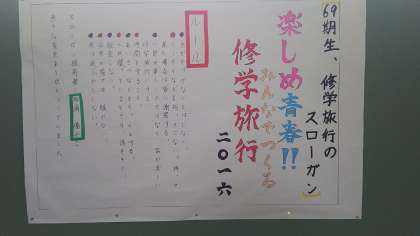 5月17日(火)3年生の修学旅行が、いよいよ来週に迫ってきました。熊本の震災の影響で計画を変更した学校がある中で、予定通りに実施できることに感謝します。3年生校舎の階段に、修学旅行実行委員が作成してくれた掲示物が掲載されています。3年生の皆さん、今週末の中間テストに全力で取り組んで来週を迎えましょう。