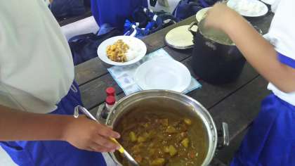 おいしいカレーができました。みんな元気で食欲旺盛です。どの班も残さずペロリと食べました。