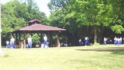みんなで協力して手際よく後片付けができたので、予定より早く学級写真を撮ることができました。時間に余裕ができたので自由時間です。みんな元気に緑の中を走り回っています。