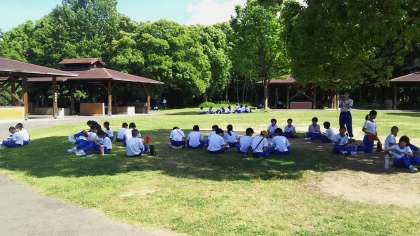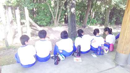 スケッチ大会です。班ごとに分かれて自然の中で色鉛筆を使ってスケッチしています。出来上がった作品は文化祭で展示します。
