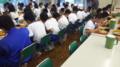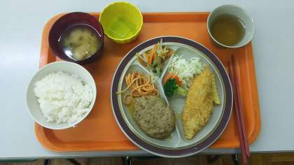 晩ごはんはのメニューは、照り焼きハンバーグと白身魚フライです。みんな元気で食欲旺盛です。