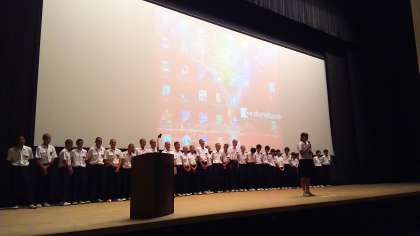 8月5日(金)住吉区民センターでの講演会終了後に、近畿大会・全国大会に出場する陸上部の生徒と、近畿大会に出場するサッカー部の生徒全員が舞台に上がり、大会での活躍を述べました。生徒全員から大きな拍手の応援をしてもらいました。