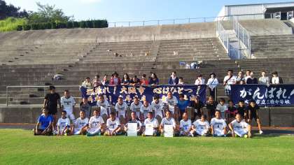 サッカー部の近畿大会の決勝戦は、善戦しましたが1−5で龍野西中学校に敗れ準優勝におわりました。昨日の予選リーグ初戦、明和中学校との試合では近畿大会の雰囲気にのまれ引き分けに終わり、背水の陣で臨んだ富雄中学校戦では後半のロスタイムの終了間際に、シュートを決めて決勝トーナメント進出を決めました。生徒たちが最後まであきらめずがんばった結果が勝利につながりました。今日の準決勝戦でも、PK戦を勝ち抜き決勝進出を果たしました。優勝こそ逃しましたが、決勝戦での敗戦は全国大会での戦いによい経験となったと思います。この二日間、保護者をはじめ大阪市中体連サッカー部の皆さまには、たいへん暑い中、応援に来ていただきありがとうございました。また、地域の皆さまにもたくさんの応援をいただき感謝申しあげます。