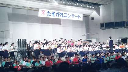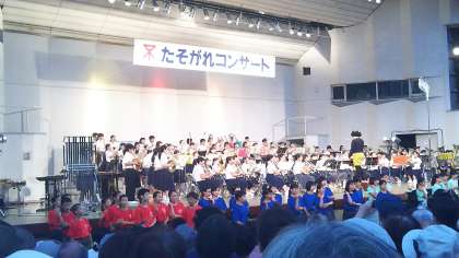 8月19日(金)大阪城野外音楽堂で開催された「たそがれコンサート」に住吉区6中学校(三稜、墨江丘、大和川、住吉、大領、東我孫子)の吹奏楽部が出演しました。開始直前に雨がぱらつきましたが、すぐに上がりました。6校の1年生も入れると総勢270名の部員が参加する合同演奏は迫力がありました。365日の紙飛行機、ドリフメドレー、昭和歌謡曲メドレー、パーフェクトヒューマン、ワシントンポストの5曲を演奏しました。趣向を凝らしたパーフォーマンスもあり、大勢の観客を楽しませ大きな拍手をいただきました。三稜中学校の吹奏楽部の皆さん、明日の大空小学校の夏祭りでの演奏もよろしくお願いします。