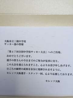 昨日8月19日(金)、Jリーグの地元チームのセレッソ大阪からサッカー部にお祝いのメッセージをいただきました。ありがとうございます。明日21日(日)の初戦は、皆さんの応援を力にして素晴らしい試合をしてくれるでしょう